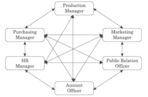 The Figure below shows the Horizontal Flow of Communication where messages or information flows among the similar or same level positions of people in the organizational structure.